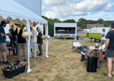 Am 11. Juli war es endlich so weit: Der sonst so konzentrierte Arbeitsalltag wich einer ausgelassenen Feierstimmung. Wir haben kurzerhand die Bürostühle in die Ecke verbannt und die Tastaturen für einen Abend ignoriert, um uns ganz dem kulinarischen und geselligen Vergnügen hinzugeben. Im Mittelpunkt standen die legendären Kreationen der Burgernerds – ihre Foodtruck-Köstlichkeiten waren so phänomenal, dass man für einen Moment vergaß, dass man eigentlich das 25-jährige Firmenjubiläum feierte und nicht etwa ein Burger-Festival. Jeder Bissen war eine kleine Offenbarung, die uns mehr als entschädigte für alle durchgearbeiteten Nächte der letzten 25 Jahre. Als perfekte Begleitung diente das handwerklich gebraute, leckere Lager von der Braumanufaktur Pohlmann, das eiskalt die Kehlen herunterlief und sich als der ideale flüssige „Treibstoff“ für die bevorstehenden Stunden der Feierlichkeiten erwies.