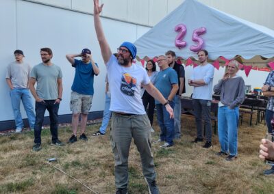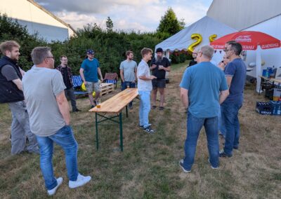 Das Spieleprogramm hatte es in sich! Höhepunkt war definitiv das Kneipenquiz, bei dem Wissen über die Firmengeschichte (und wahrscheinlich auch über das Leben der Geschäftsführung) gefragt war. Aber das absolute Highlight? Der Festplattenweitwurf! Ja, du hast richtig gelesen. Alte, ausgediente Festplatten flogen in hohem Bogen über den Hof. Eine perfekte Mischung aus sportlicher Betätigung und dem finalen Abschied von veralteter Technik. Unsere Kollegen Linus und Marc haben sich dabei besonders hervorgetan und verdiente Preise abgeräumt – ob für brillanten Weitwurf oder überirdisches Firmenwissen, das sei mal dahingestellt. Hauptsache, die Ehre war gerettet!