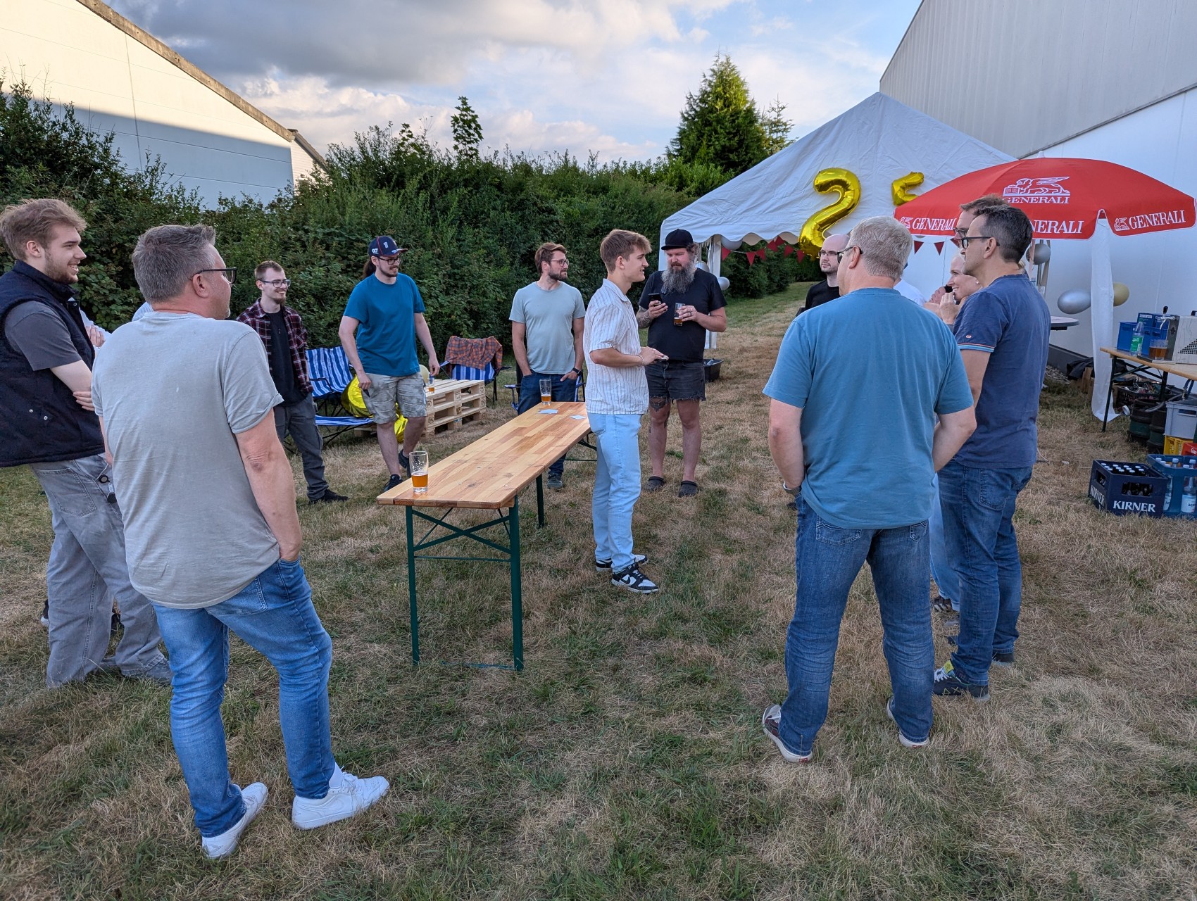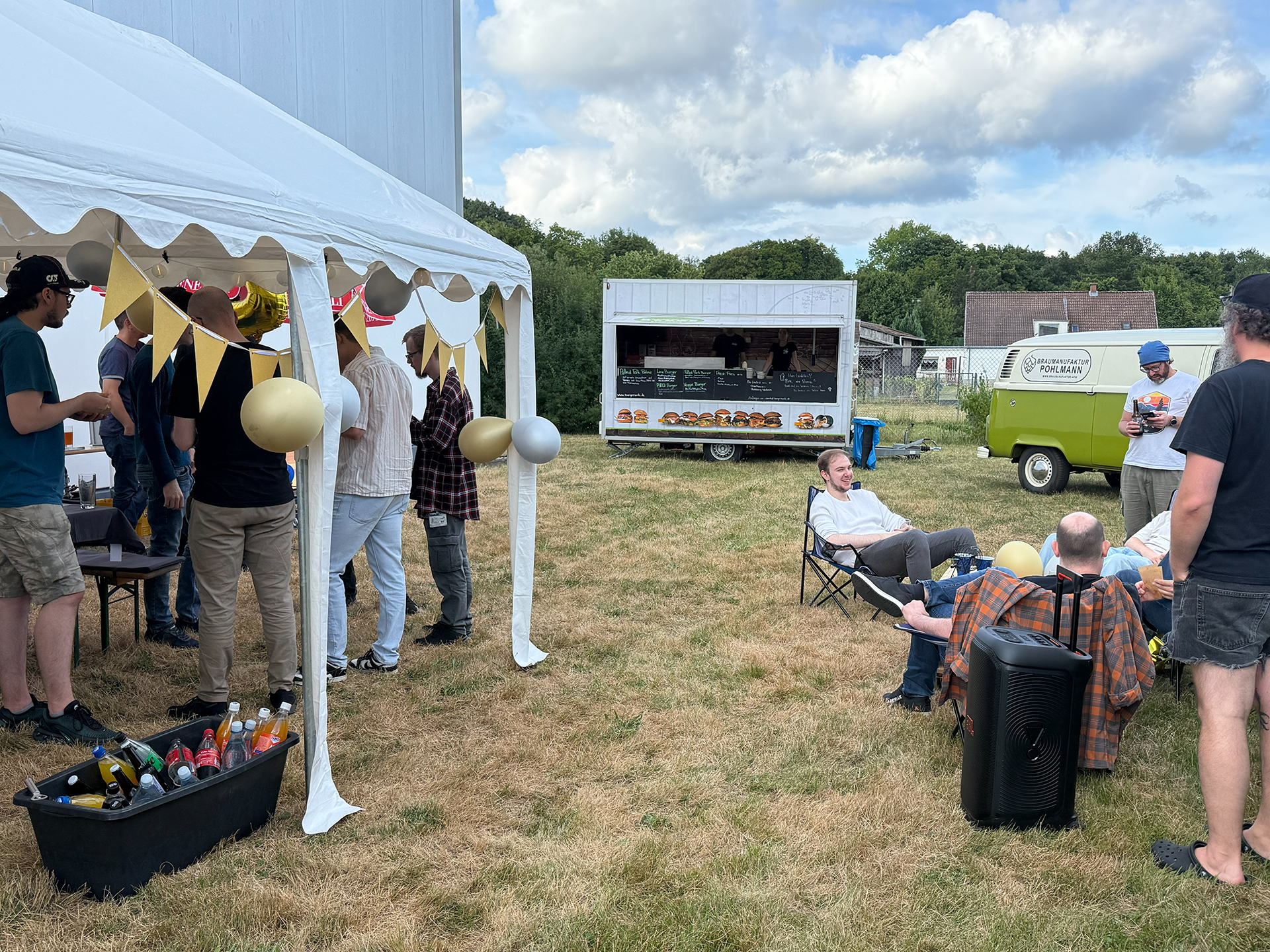 Am 11. Juli war es endlich so weit: Der sonst so konzentrierte Arbeitsalltag wich einer ausgelassenen Feierstimmung. Wir haben kurzerhand die Bürostühle in die Ecke verbannt und die Tastaturen für einen Abend ignoriert, um uns ganz dem kulinarischen und geselligen Vergnügen hinzugeben. Im Mittelpunkt standen die legendären Kreationen der Burgernerds – ihre Foodtruck-Köstlichkeiten waren so phänomenal, dass man für einen Moment vergaß, dass man eigentlich das 25-jährige Firmenjubiläum feierte und nicht etwa ein Burger-Festival. Jeder Bissen war eine kleine Offenbarung, die uns mehr als entschädigte für alle durchgearbeiteten Nächte der letzten 25 Jahre. Als perfekte Begleitung diente das handwerklich gebraute, leckere Lager von der Braumanufaktur Pohlmann, das eiskalt die Kehlen herunterlief und sich als der ideale flüssige „Treibstoff“ für die bevorstehenden Stunden der Feierlichkeiten erwies.